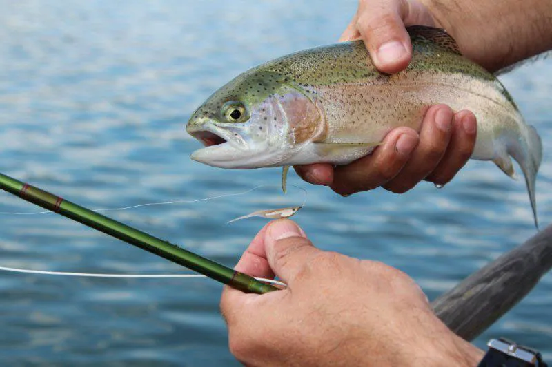 A lake rainbow has fallen for a small baitfish imitation using a Fleye Foil