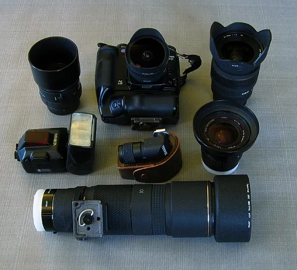 This is a part of my SLR equipment. The camera is a digital Konica Minolta 7D and the lenses range from 16mm wide to 300mm telephoto (450 with a converter). Also seen is the flash and an angle finder. Toting this around on a fishing trip will add about 5.5 kilos or 11 lbs to your carrying weight.