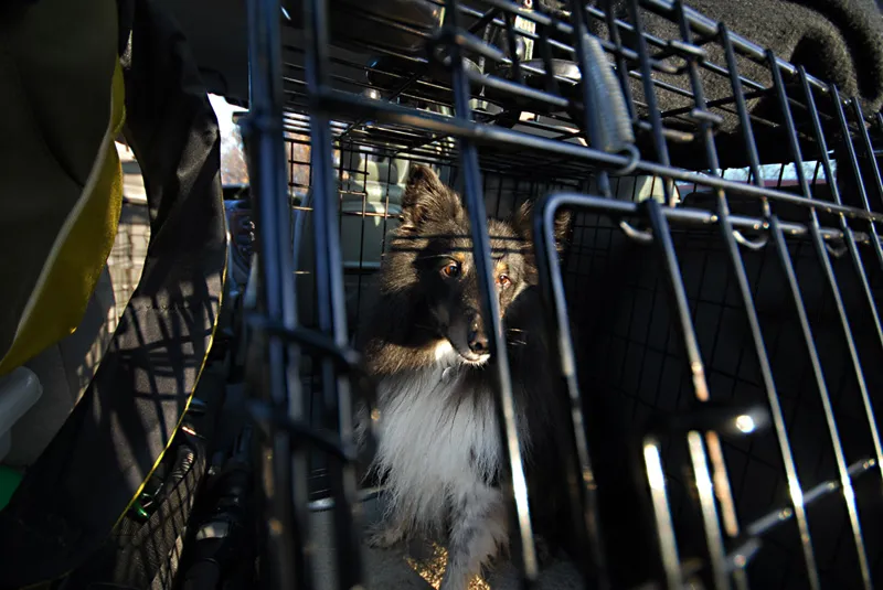 My dog Divus looking less happy than he is in his cage in the back of the car