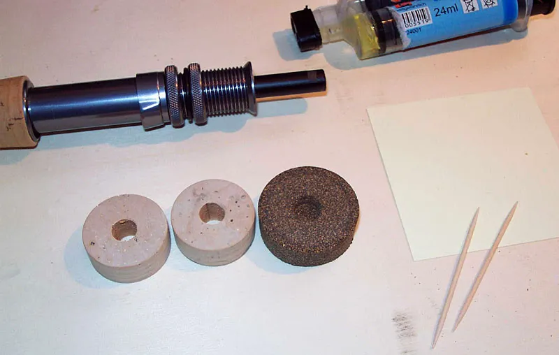 Toothpicks, epoxy glue, a post it note and the prepared cork rings and the rubber cork disc. Note the slight drill in the rubber cork disc.