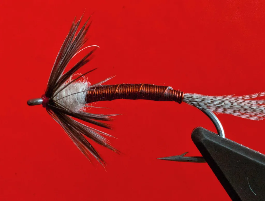 This fly has just a few wraps to finish it in spite of having a front hackle. A hackle stem needs very little thread to hold it.