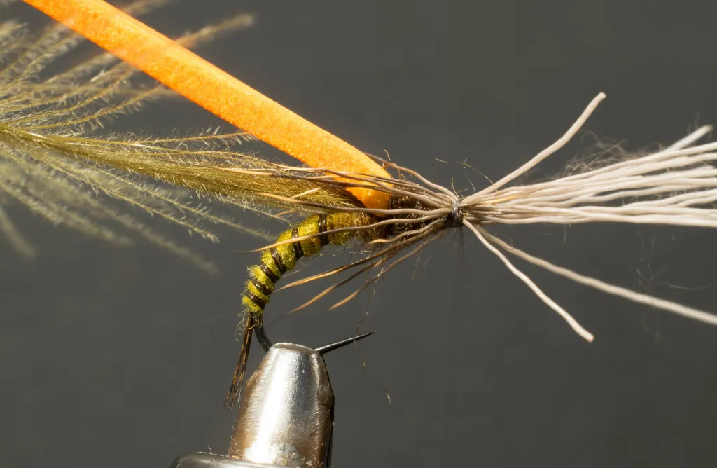 Tie in a few deer hairs with the tips to the rear and protruding under the hook shank. They should touch the hook point and then a bit.