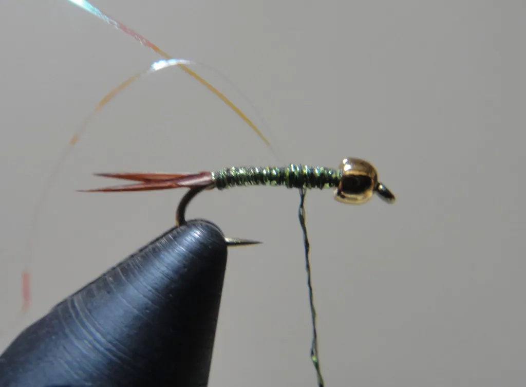 Tie in two pieces of flash a little over a beads length back from the bead.
