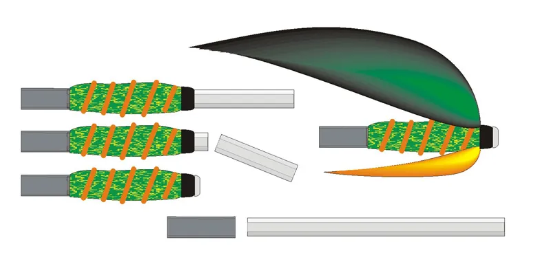 This illustration shows how the fly can be tied on an untrimmed tube, and trimmed and melted after the fly is finished. You can also see that the junction tube has been tied down under the material, and has become an integral part of the fly.