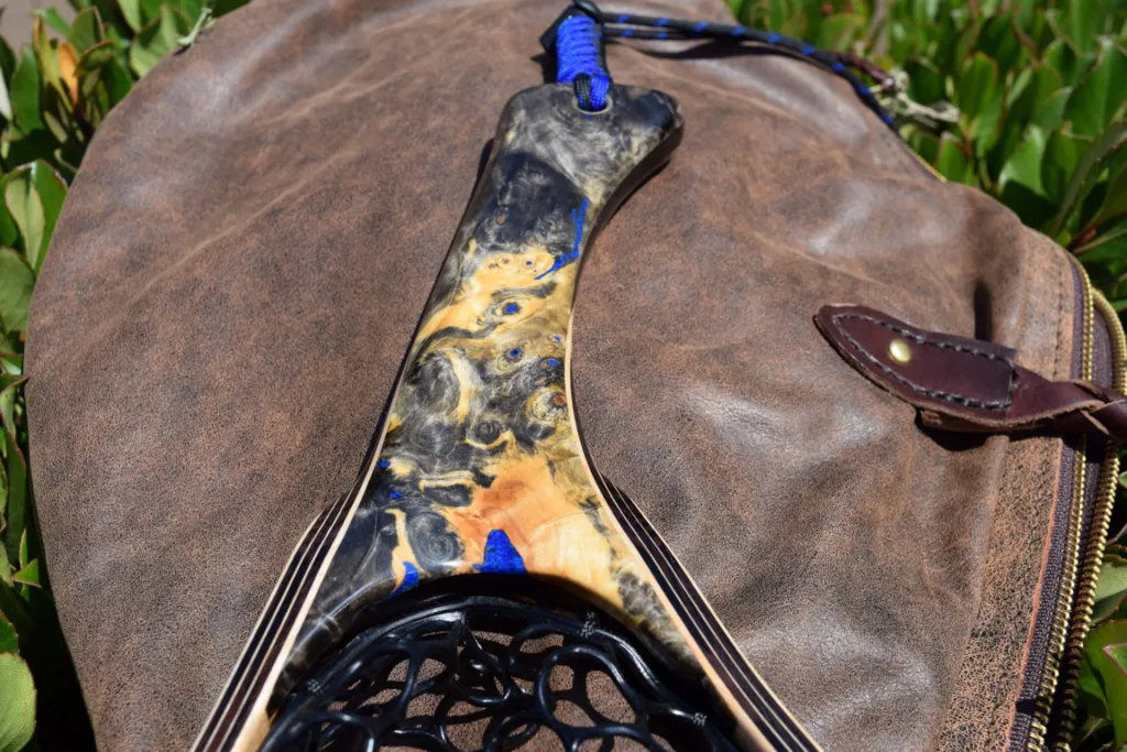A gorgeous two-toned blue merle/blonde buckeye burl curved net on its custom WWII leather case