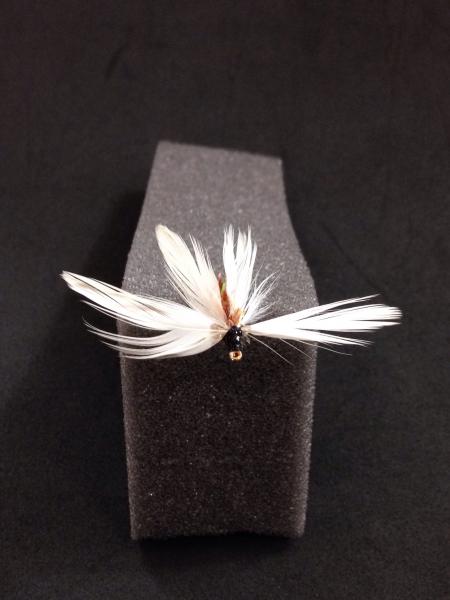 "White Glider" built on a size 12 dry fly. The feathers used came from a white hen hackle. The body was rust colored cactus chenille. The thread was black 6/0 thread.